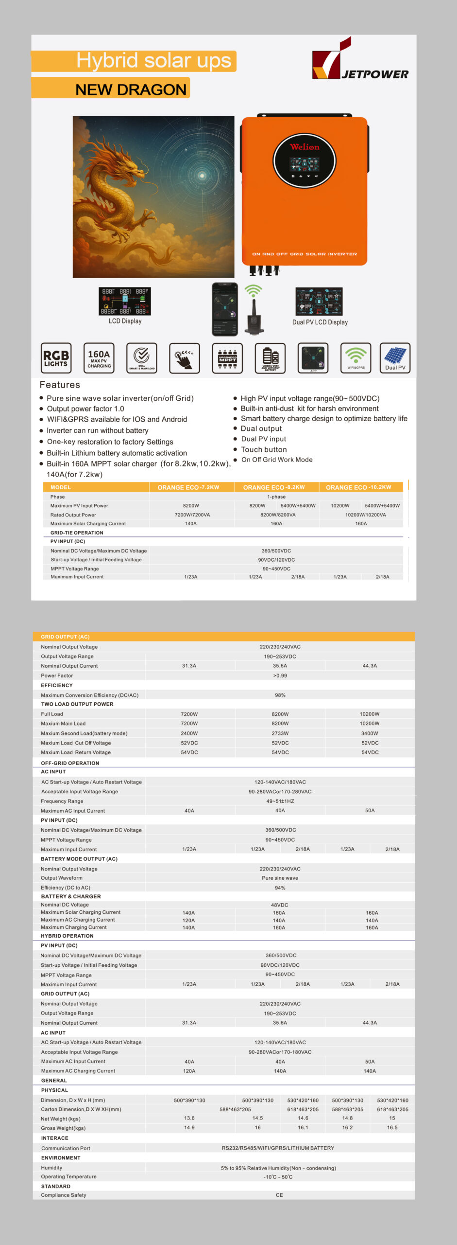 اینورتر خورشیدی هیبریدی جت پاور مدل NEW DRAGON از سری محصولات پیشرفته شرکت JetPower است که با راندمان بالا، فناوری MPPT، پشتیبانی از ورودی دوگانه (Dual PV Input) و قابلیت کنترل از طریق WiFi و GPRS طراحی شده است.